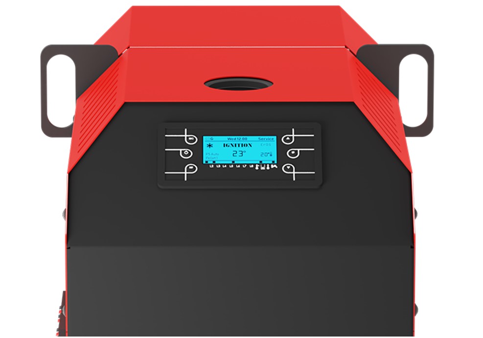 Brûleur 35 kW (plage de fonctionnement 5 à 35 kW) à chambre de combustion avec grille. Le nettoyage est assuré entre les phases de chauffe par le ventilateur de combustion, en vitesse rapide.