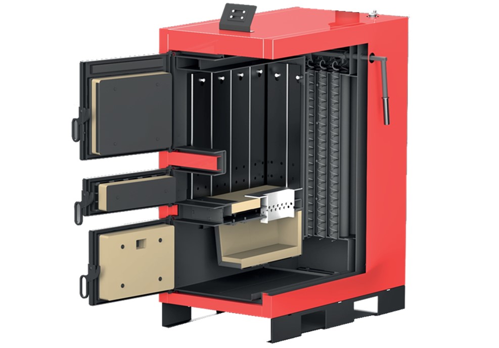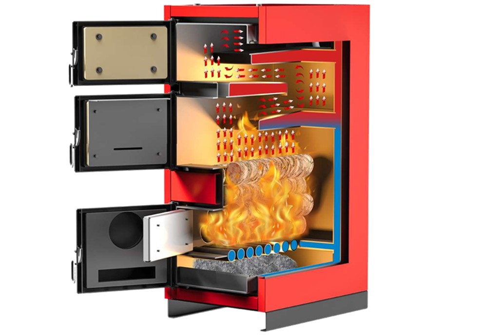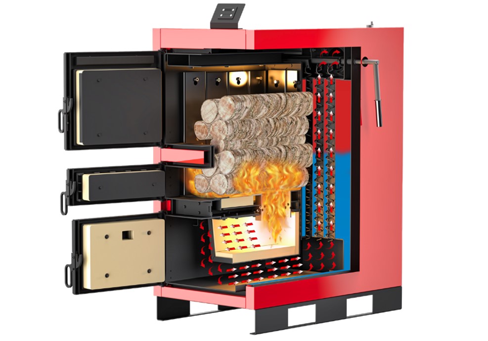 Porté à haute température, le bois s’assèche puis se consume. Une grande partie du combustible se transforme alors en gaz, qui fait l’objet d’une seconde combustion dans la chambre basse. L’énergie dégagée est transmise à travers cette dernière et tout au long du parcours de fumées interne à l’enveloppe d’eau de chauffage.