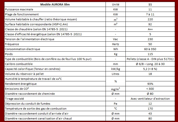 Les poêles AURORA SLIM 11 kW bénéficient d’un classement énergétique A++. Leur rendement est de 93%.